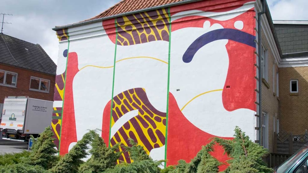 This gable painting was created by Leif Jepsen in 1968. The big size of the building visually increases because of the size of the dog.