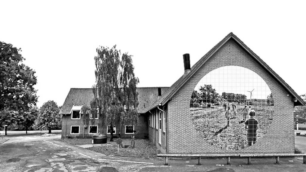 The original photograph was taken with school children and teachers from the small school in the Skarrild-Karstoft community in the lead role. It is the people at this school who have determined the location of the picture (near the school) and which elements, values and main characters appear in it (which include childhood, the natural and rural environment, a windmill, freedom, a future with solidarity etc.).
